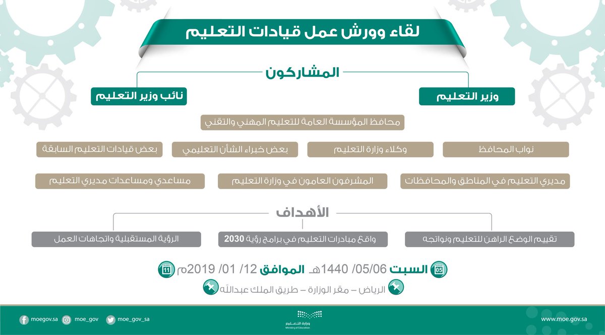جاء ذلك خلال لقاء وزير التعليم بقيادات التعليم العام والتقني والمهني وبعض قيادات التعليم وبعض خبراء التعليم، ضمن ورشة عمل في مقر الوزارة، والعمل على تعزيز الأدوار المنوطة بوزارة التعليم لتحقيق رؤية المملكة 2030.
