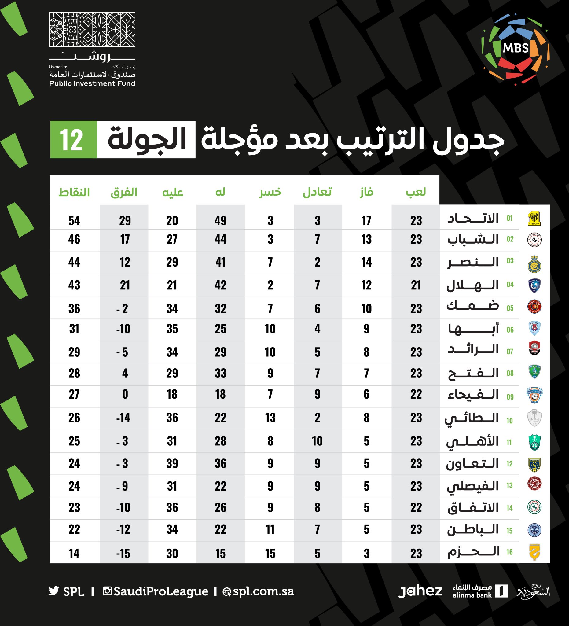 وبعد انتهاء الكلاسيكو، حافظ فريق الاتحاد على صدارة جدول ترتيب أندية المسابقة برصيد 54 نقطة، ويليه نادي الشباب ثانيًا برصيد 46 نقطة، فيما جاء النصر في المركز الثالث بـ44 نقطة، وجاء الهلال رابعًا برصيد 43 نقطة، وضمك خامسًا برصيد 36 نقطة.