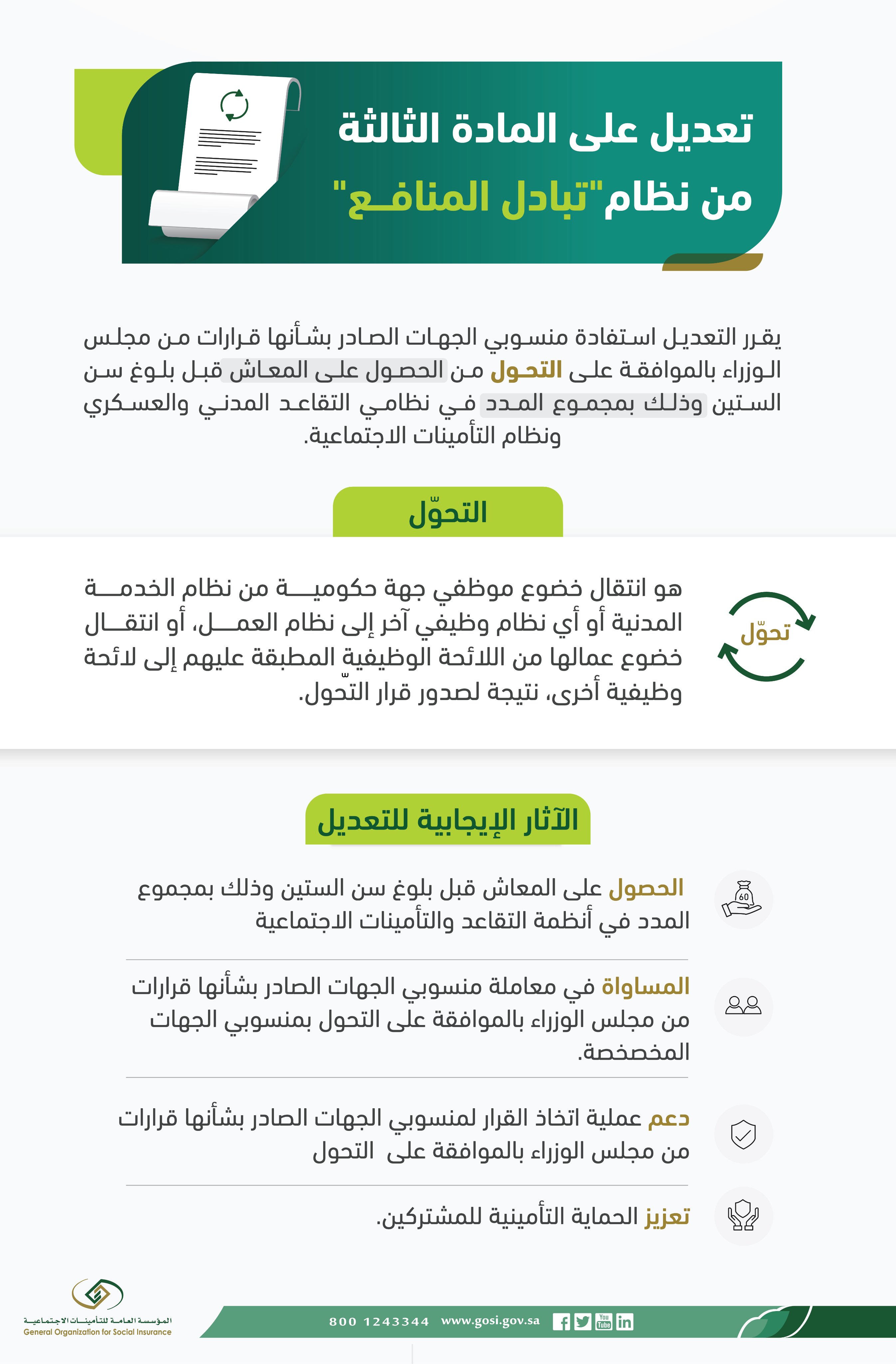 وأبانت أن تعديل هذه الفقرة من نظام تبادل المنافع يهدف لحفظ الحقوق وتحقيق الطمأنينة والاستقرار بين الموظفين الذين تم تحويلهم من نظام التقاعد المدني وتغطيتهم بنظام التأمينات الاجتماعية نتيجة عملية التحول التي تشهدها بعض القطاعات.