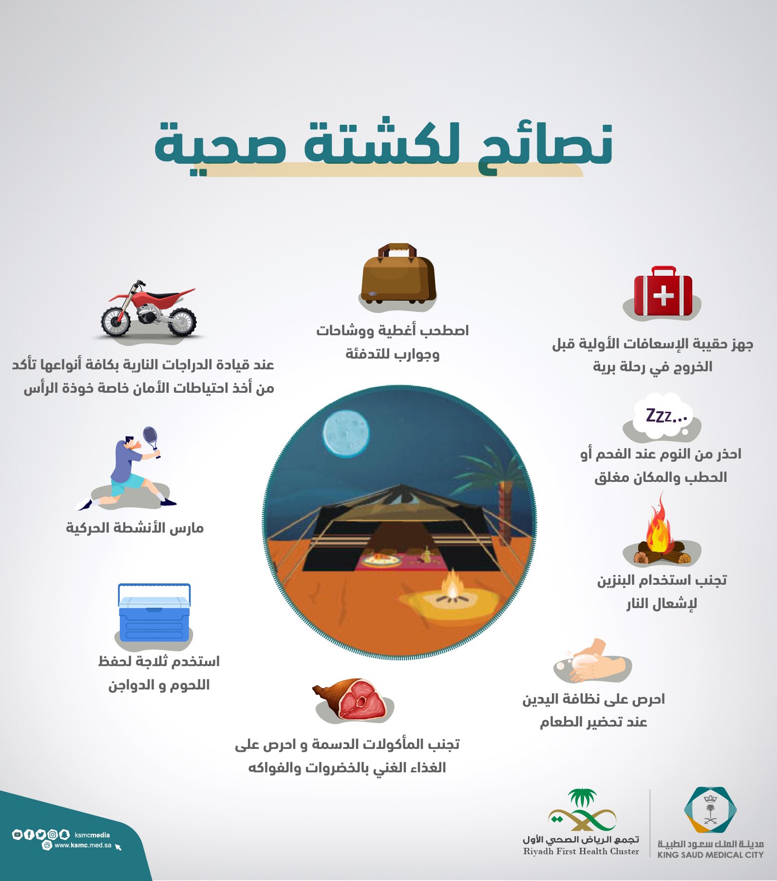 قدمت مدينة الملك سعود الطبية عدداً من النصائح لأصحاب الكشتات، منها: اصطحاب أغطية، ووشاحات، وجوارب للتدفئة، وتجهيز حقيبة الإسعافات الأولية قبل الخروج في رحلة برية.