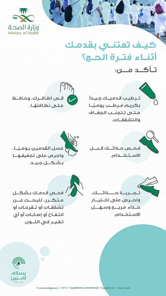وبيّنت الوزارة أنه للاعتناء بالقدم أثناء فترة الحج يجب التأكد من 6 خطوات؛ وهي: “ترطيب القدم جيدًا بكريم مرطب يوميًّا؛ حتى تتجنّب الجفاف والتشققات، وقص الأظافر، والمحافظة على نظافتها، وفحص الحذاء قبل الاستخدام”.